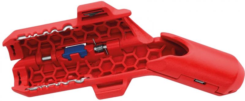 Funkčná všestrannosť univerzálneho nástroja na odpláštenie a odizolovanie kábla alebo vodiča spočíva v jeho inovatívnom dizajne, vrátane užitočných detailov vo vnútri nástroja. Dizajn dvojplášťovej pištoľovej rukoväte umožnil integrovať hneď niekoľko funkcií pre odizolovanie a odpláštenie pre všetky bežné elektroinštalačné situácie. Knipex ErgoStrip navyše mimoriadne dobre a prirodzene sedí v ruke. Konce nástroja sú skosené do kužeľovitého tvaru, čo umožňuje priestorovo úsporné montážne práce, napríklad v zásuvkách pod omietkou. Prepracovaný dizajn dovoľuje zjednodušené zasunutie jednotlivých vodičov na odizolovanie pomocou presných polohovacích hrebeňových otvorov. Označenia vo vnútri odizolovacieho náradia Knipex ErgoStrip - integrovaná dĺžková stupnica - zase docielia presné opakované odizolovanie jednotlivých vodičov a precízne odpláštenie koaxiálnych káblov. Priestor na konci nástroja ErgoStrip pre vkladanie káblov disponuje otváracou pomôckou - špeciálnym skosením nástroja smerom dovnútra, aby káble jednoducho skĺzli do nástroja. Jednoduchý otočný pohyb pri odplášťovaní a odizolovaní alebo priamočiary rez v prípade väčších odplášťovacích dĺžok a požadovaný výsledok je dosiahnutý.