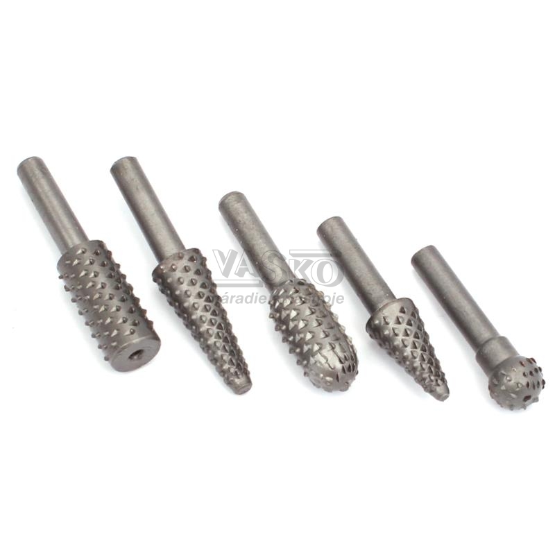 Rotačné rašple na drevo so stopkou 6,35mm v sade 5 kusov rôznych tvarov možno veľmi účinne využiť v priamej brúske, alebo s menšou účinnosťou v klasickej vŕtačke.