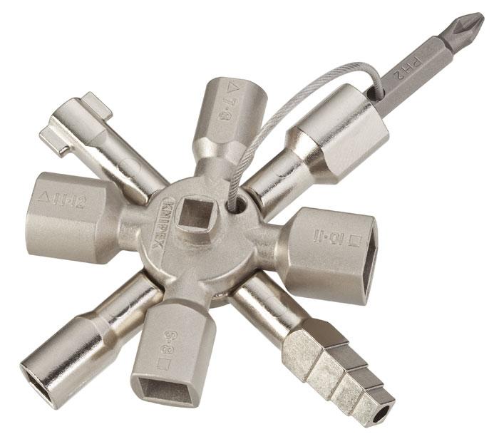 Multifunkčný kľúč pre ovládanie uzáverov z oblasti techniky budov (kúrenie a sanitárne zariadenia, klimatizačná a vetracia technika, elektrotechnika), zásobovanie plynom a vodou a uzatváracích systémov.