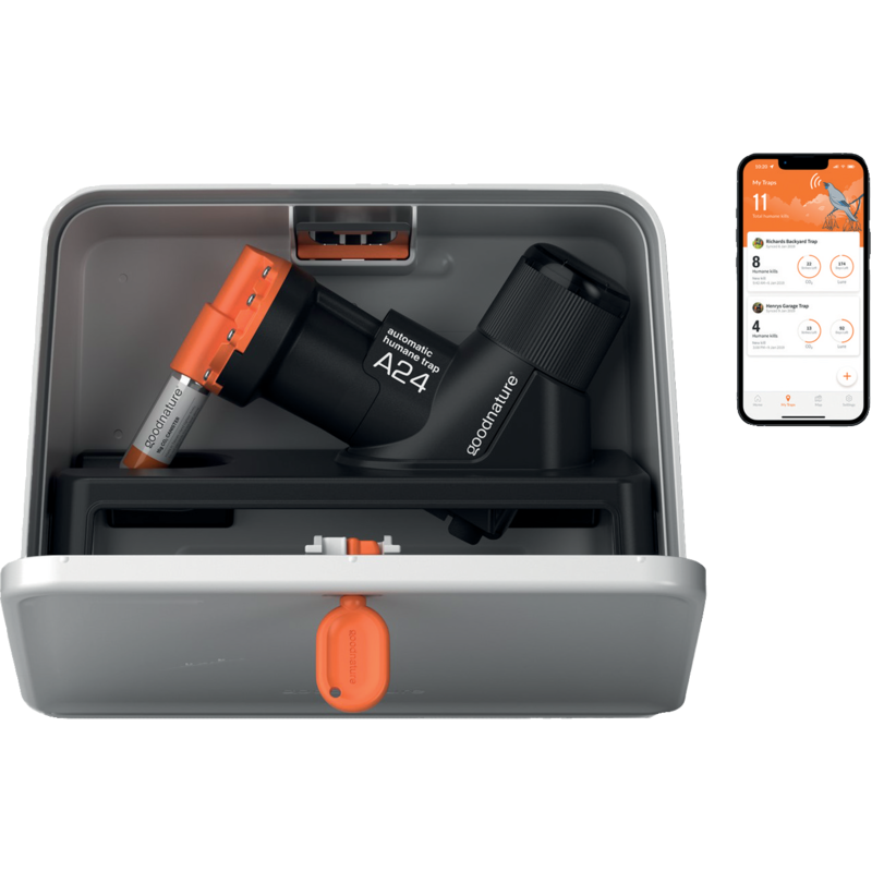 Inteligentná pasca Goodnature je pasca bez jedov. Po aktivovaní pasce škodca spadne a pasca sa automaticky nabije 24x na jednu CO2 bombičku. To vám umožní eliminovať viacero potkanov alebo myší bez nutnosti resetovania pasce. Ak je pasca umiestnená vonku, telo môže bezpečne zožrať iné (divoké) zviera. Môžete použiť bezplatnú aplikáciu Goodnature, aby ste videli, ako často bola pasca spustená a kedy je potrebné vymeniť CO2 bombičku a návnadu. Môžete tiež dostať upozornenie, keď sa pasca spustí.